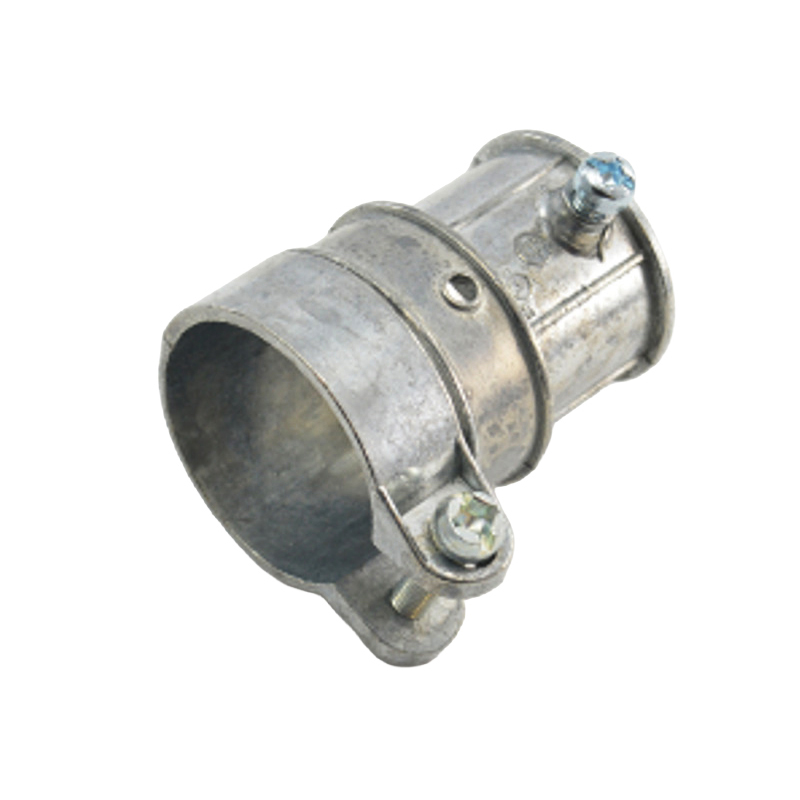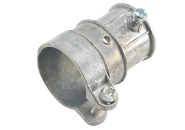 Zinc transition coupling for connecting 1/2″ EMT to 3/8″ FMC, AC, MC, or NM cable. Set-screw EMT side and strap clamp for flex.