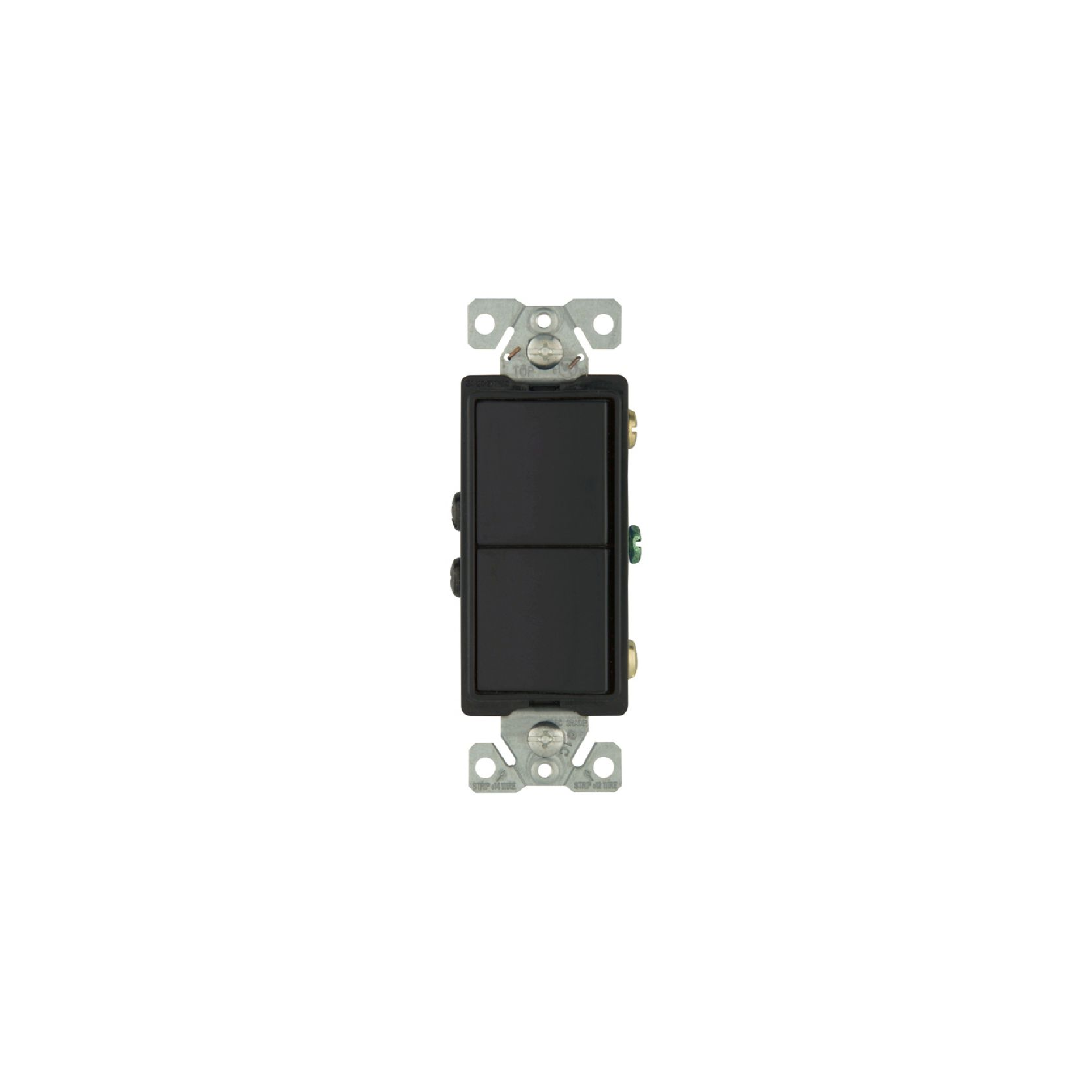Eaton commercial grade combination switch, auto-grnd, Decorator, #14 – #12 AWG, 15A, resi, comm, 120/277V, bk and sd wiring, Rocker, Maint closure, Screw, Brass, blk, -20-60?C, (2) 1-pole, dplx, thermoplas, polycrb, PVC
