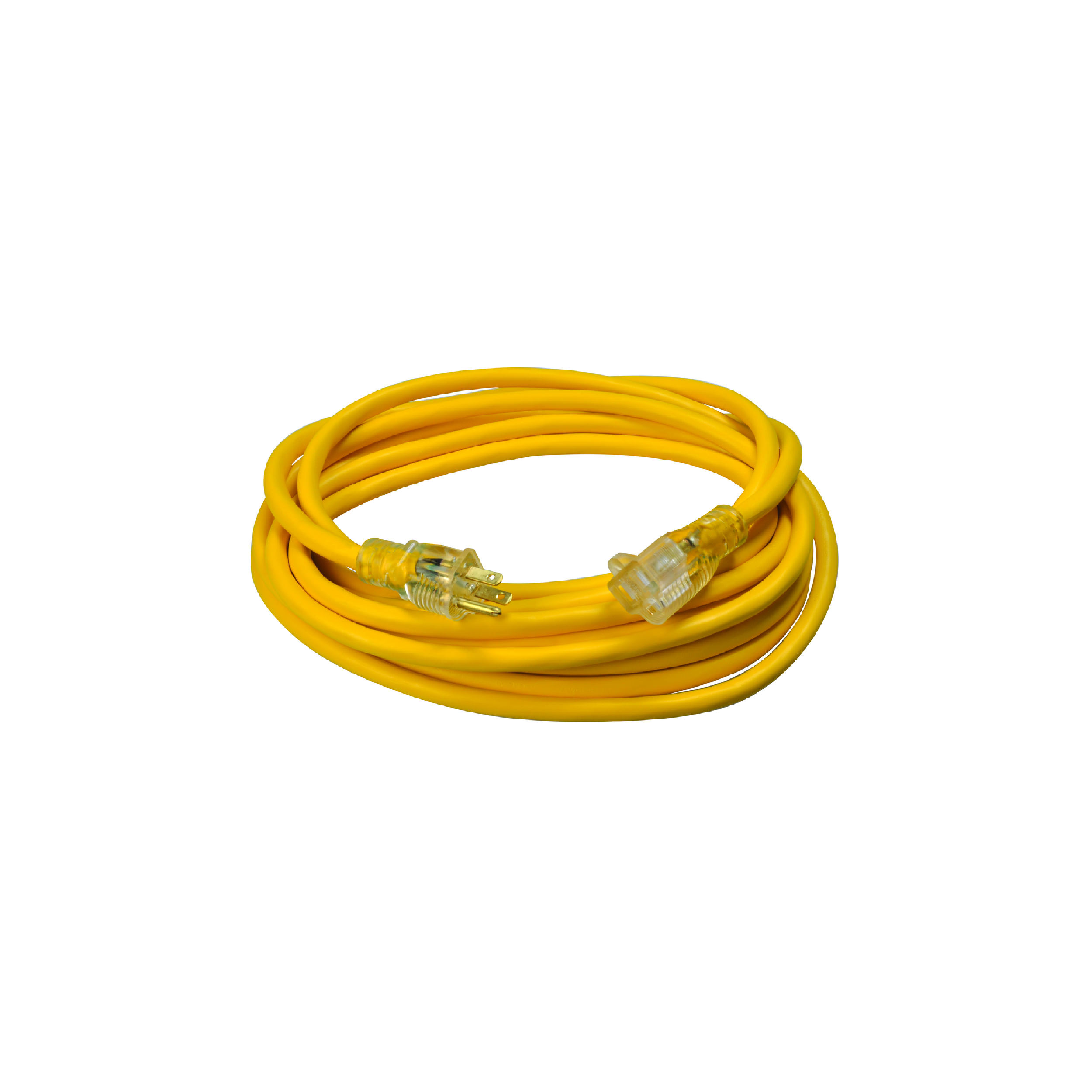 This heavy-duty 25-foot extension cord is designed for professional use with all-copper wiring to safely power heavy-duty equipment and tools. The highly visible bright yellow jacket enhances safety on job sites and helps prevent loss or theft. Its waterproof, flexible vinyl jacket protects against moisture, abrasion, and sunlight, while the extra-durable, oversized clear molded plug prevents accidental bending or breaking and is UL listed for safety. A lighted end indicates when power is on and the cord is ready to use. Backed by a limited lifetime warranty, this extension cord combines durability, safety, and convenience for demanding work environments.