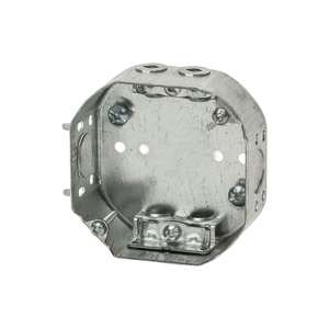 4 inches octagonal box 1-1/2 inches depth 15 cubic inches volume. Clamps for nonmetallic sheathed cable or armoured cable. Raised ground screw.
