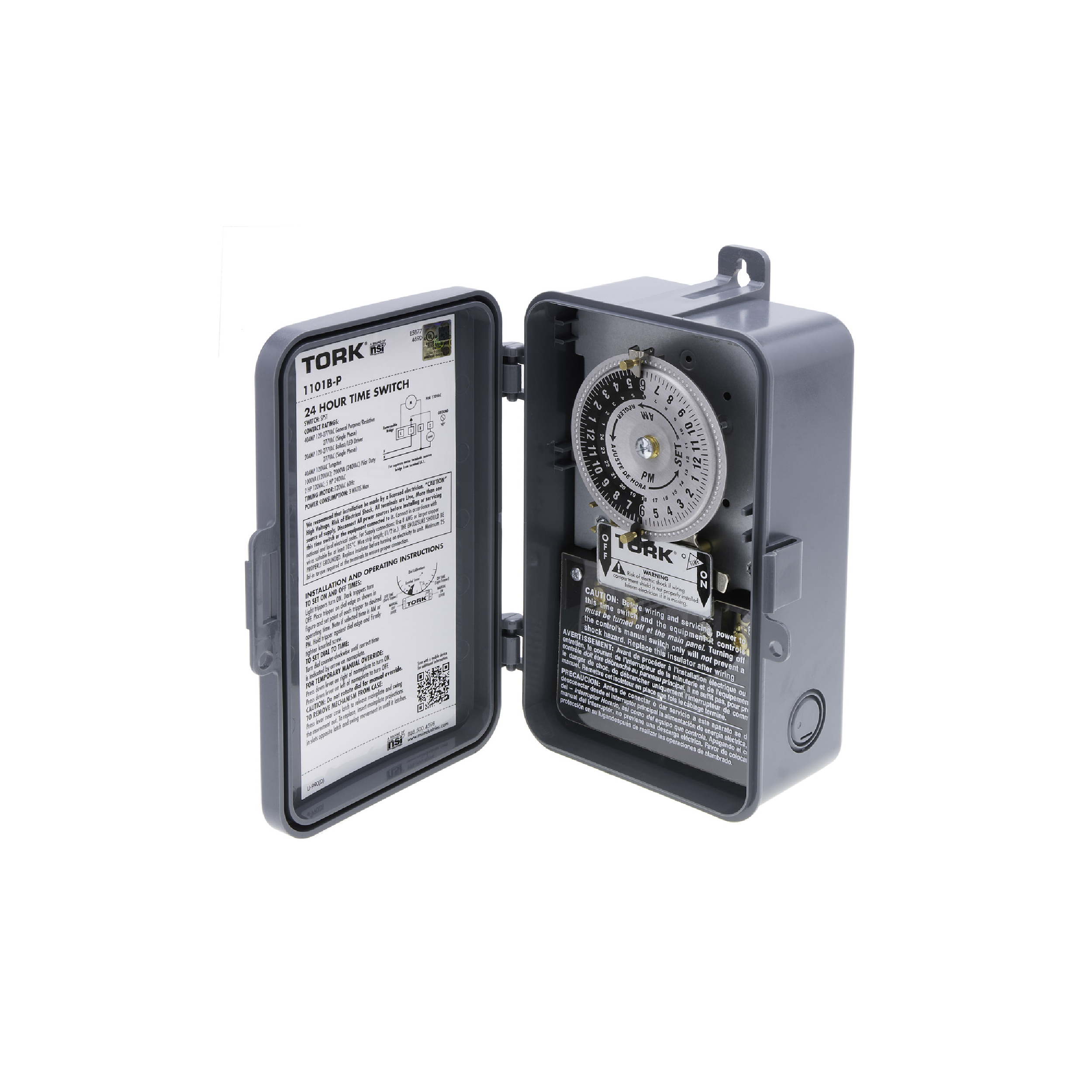 TORK 24-hour mechanical time switches provide a simple and reliable way to set recurring ON/OFF cycles for air conditioners, lights, water heaters, pumps, signs, fans, and other appliances, helping to control power consumption for devices used at the same time each day. Designed for easy scheduling, these switches allow you to automate daily operations, while repairable components extend the unit’s life, saving money and reducing waste. Built to last, the polycarbonate NEMA Type 3R lockable enclosure protects internal gears, and the timer operates reliably in temperatures from -40 to 165°F (-40 to 74°C). With compatibility for up to 12 pairs of trippers, these switches offer flexible automation for advanced 24-hour schedules. Professional-grade and cULus-listed, they support 40A at 120V, feature SPST outputs, and accept #8–#14 AWG wiring, ensuring reliable performance in demanding applications.